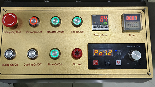 Drum speed control and emergency stop on the side of the control panel. Two layers of safety protection: Emergency stop, power and gas cut off, drum does not rotate. Second:Reaching the preset temperature. Stop heating.